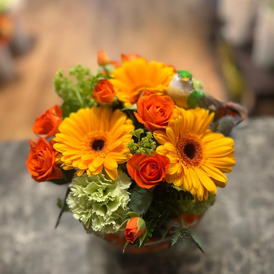 Reflet d’Été est une petite composition florale pleine de fraîcheur et de charme. Ses fleurs aux tons chauds et lumineux rappellent les couleurs douces de la saison estivale : un mélange léger, joyeux et naturel.